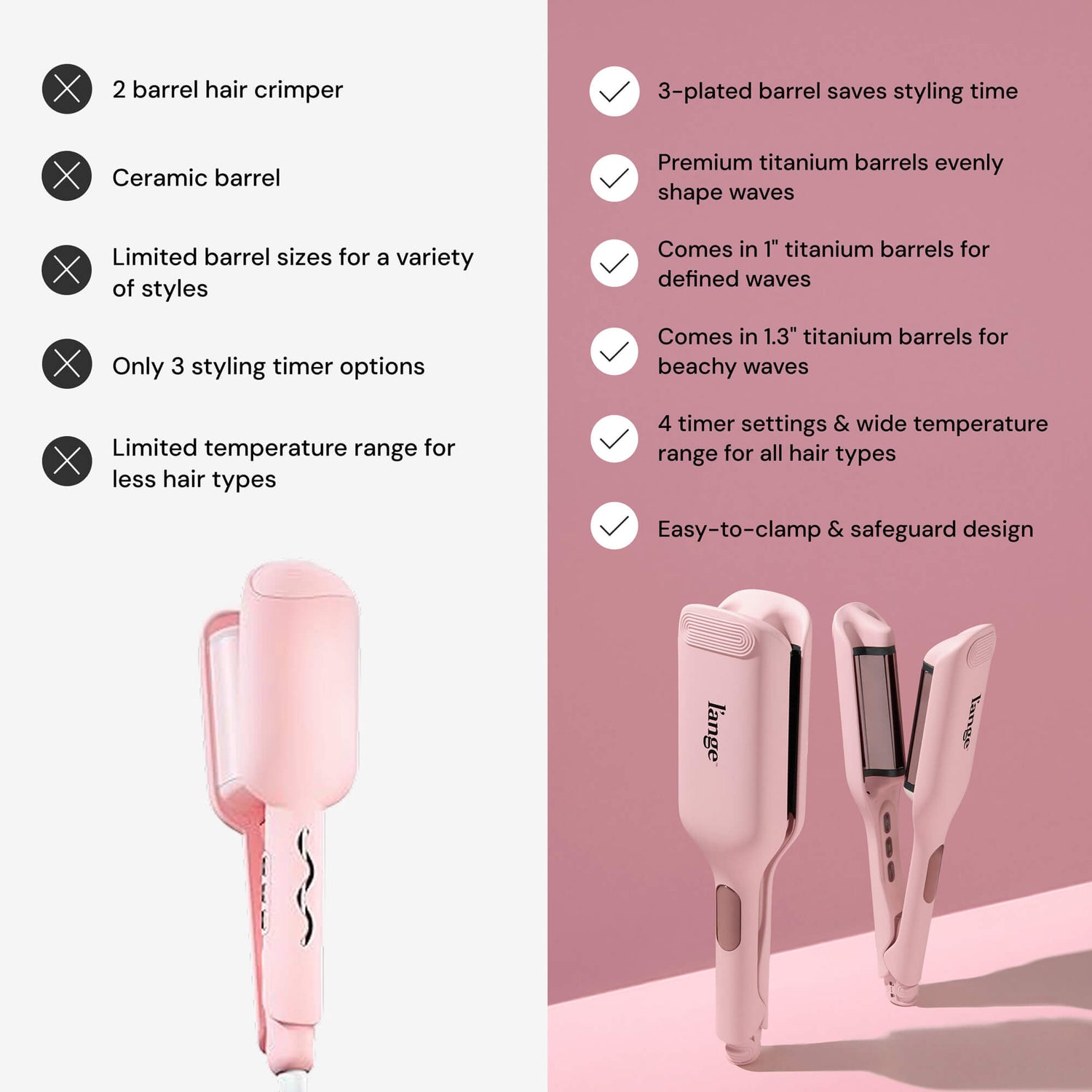 The SculptWaver features premium 1” (25mm) and 1.3” (32mm) titanium barrels designed for smooth clamping and snag-free styling.